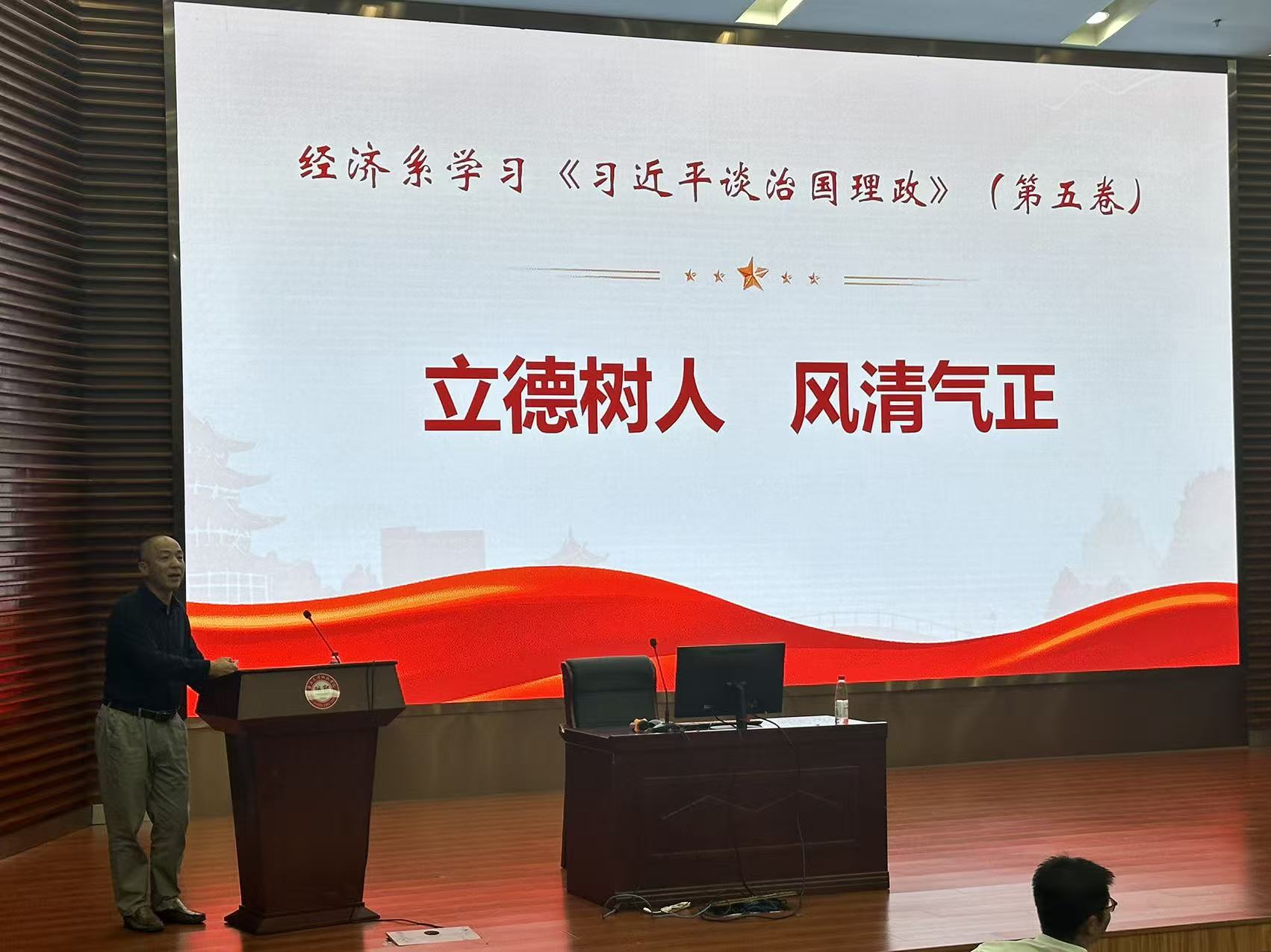 为深入学习贯彻《习近平谈治国理政》第五卷中关于全面从严治党和建设教育强国的重要论述,持续推进党风廉政建设,优化铸魂强师,2025年10月22日,经济系党委组织召开师德师风与廉洁从教专题教育会议。系党委书记吴余舟同志作专题报告,全系教职工及学生党员共同与会学习。