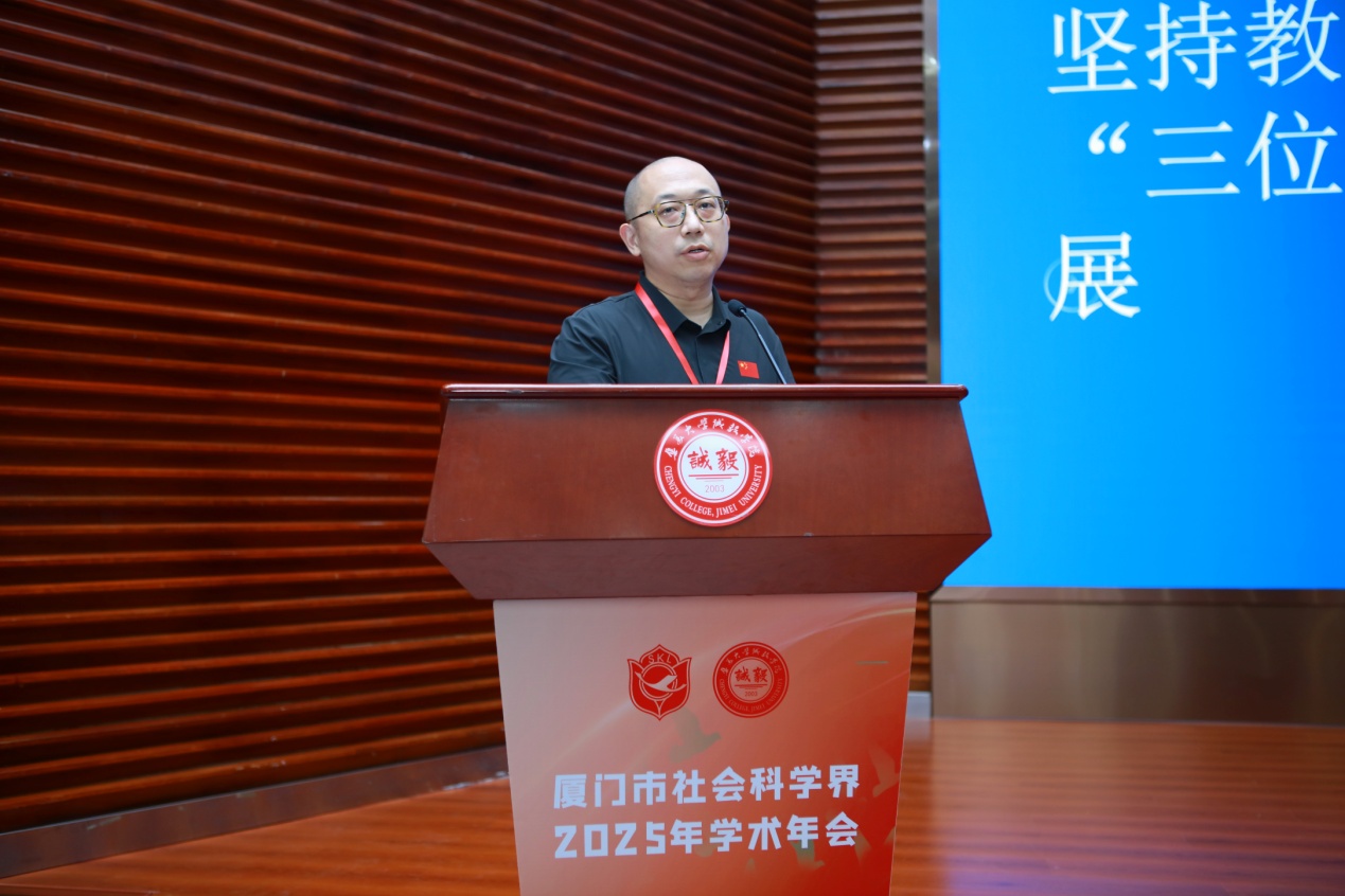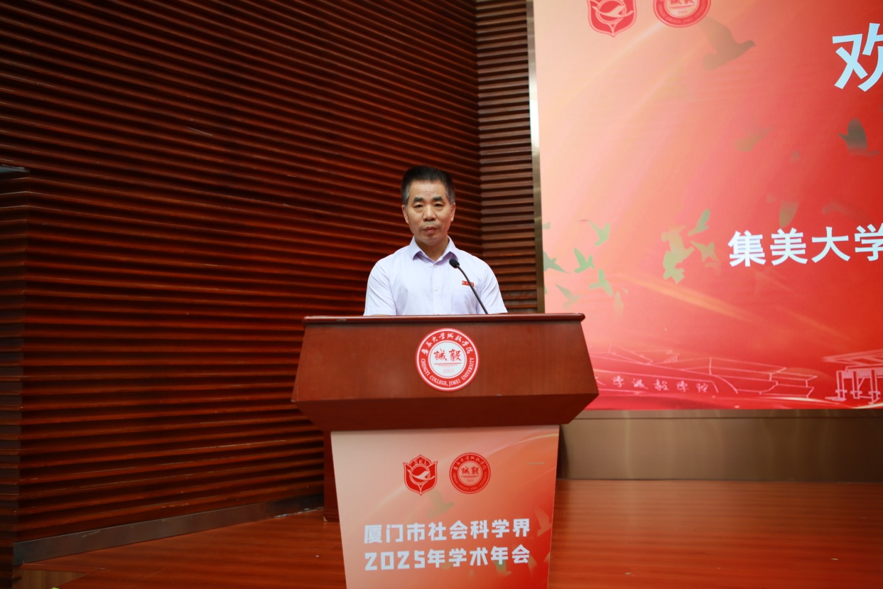 2025年10月25日,厦门市社会科学界2025年学术年会“破局立新共融共赢——人工智能条件下社科赋能经济建设新生态”在集美大学诚毅学院隆重举行。福建省纪律检查委员会原副厅级纪检监察专员、福建省纪委宣传部原部长陈晓声、厦门市社科联原秘书长、一级调研员魏志坚、市委讲师团原团长曹远洲、市委党校教授方和荣、厦门市企业管理学会名誉会长、厦门大学中科创业学院常务副院长、厦门大学管理学院教授唐炎钊、厦门经济管理学院教务处处长、网络中心主任、企业管理培训处处长胡加生、中共厦门市委党校社会和生态文明教研部副主任蔡旭、集美大学诚毅学院院长、教授许志龙,集美大学科研处副处长林嫦娥、集美大学教授、福建省民间文艺家协会副主席,厦门市作家协会原副主席夏敏、厦门市企业管理学会会长、楷立成长(厦门)教育研究院院长刘炜、厦门坤沅文化传媒有限公司总经理许俊仁等出席年会。